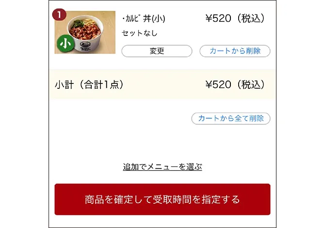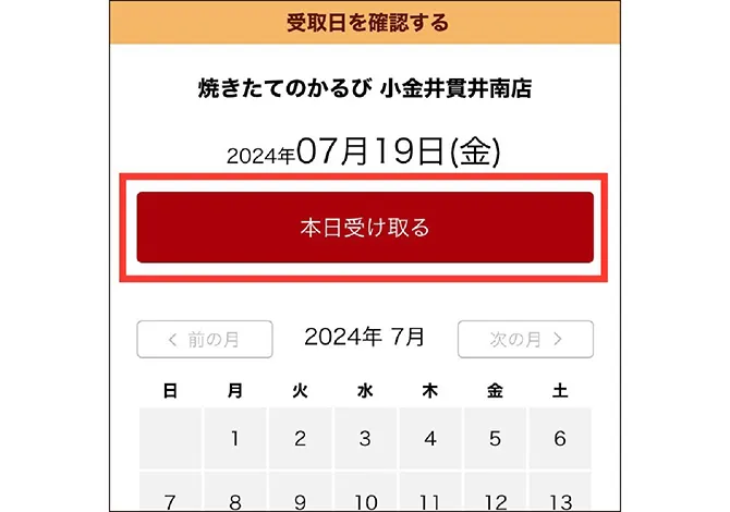 焼きたてのかるび公式アプリより、事前にテイクアウト商品を注文できるサービスです。 画面上で商品と受取時間を選択し、オンライン決済することで、 ご希望時間に合わせて並ばずに商品を受け取ることができます。
